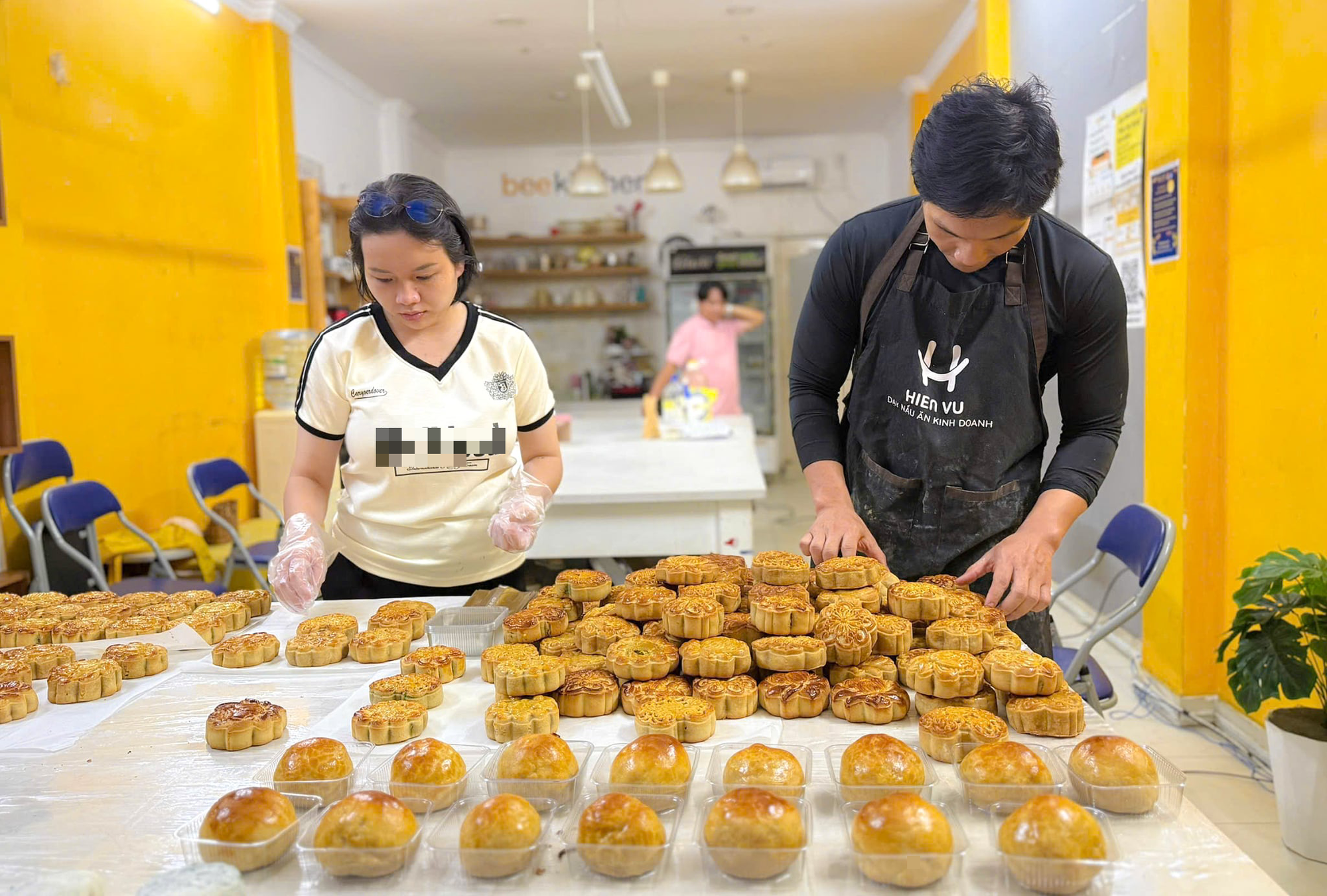 Muốn làm được bánh trung thu tặng bệnh nhân suy thận, thầy Mai Quyết Thắng (trái) phải đi tìm chuyên gia hỏi và xây dựng theo đúng chế độ ăn kiêng - Ảnh: NVCC